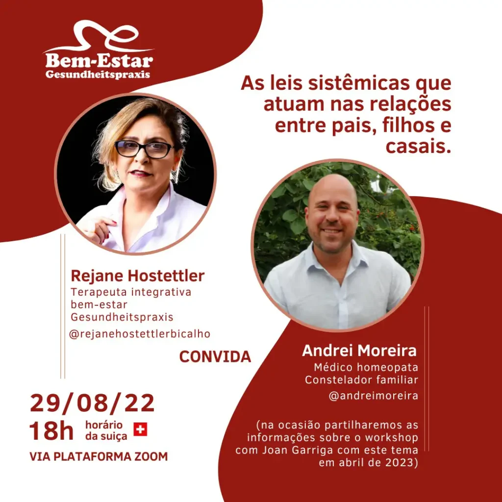 Encontro com @andreimoreira na segunda-feira, 29 de agosto às 18h00 🇨🇭via Zoom Platform. Neste encontro Andrei Moreira vai nos oferecer seu conhecimento e experiência sobre as leis sistêmicas que atuam nas relações entre pais, filhos e casais, além de esclarecer sobre o workshop com Joan Garriga. Estou te esperando! Se deseja estar connosco, por favor, confirme presença. Grande abraço. Até breve!